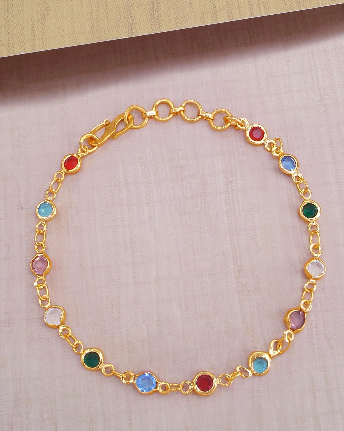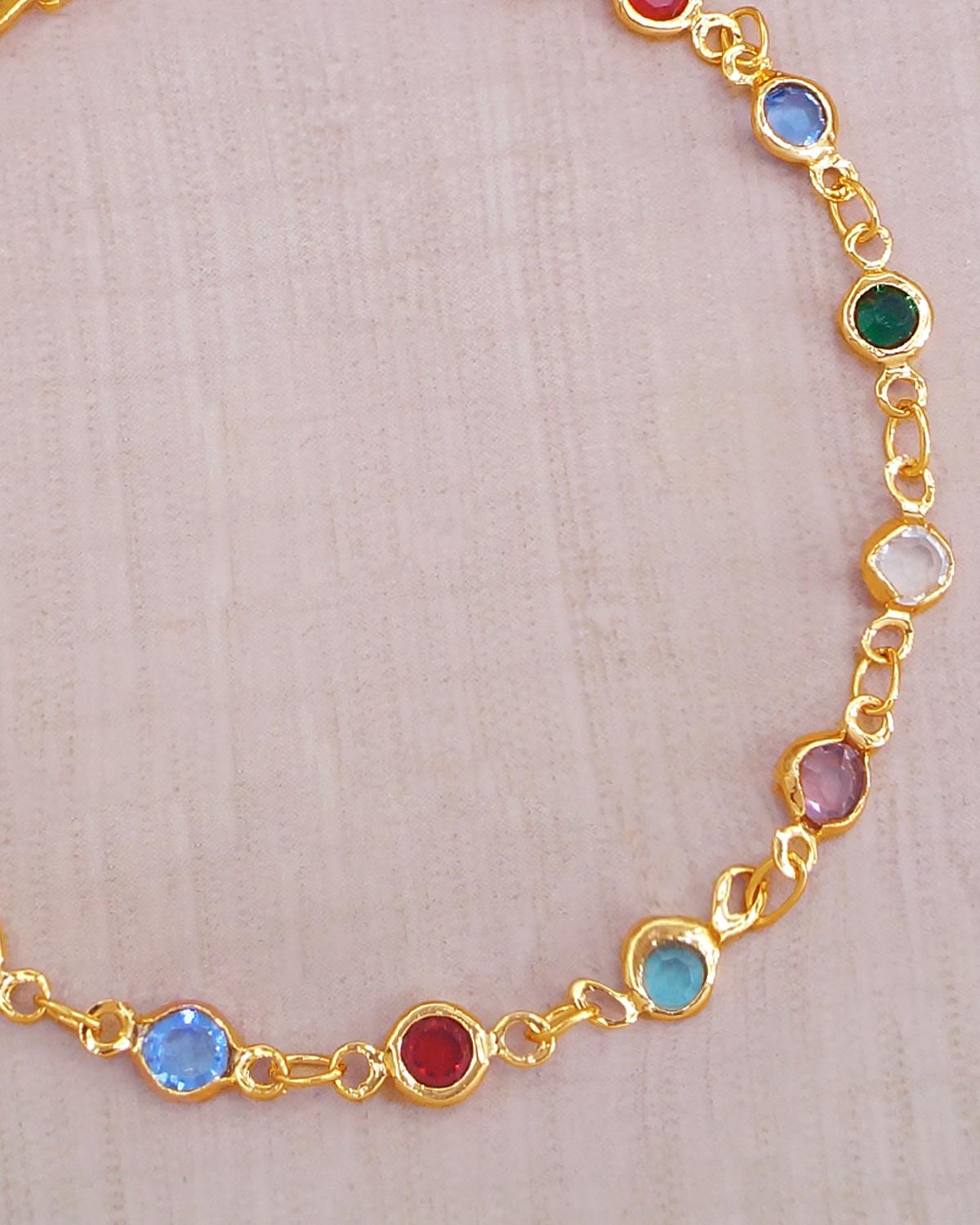 Add a vibrant touch to your jewelry collection with this exquisite gold-plated multicolor gemstone charm bracelet. Featuring a delicate chain adorned with dazzling round-cut gemstones in a spectrum of colors, this bracelet is perfect for those who love elegance with a playful twist. Its adjustable design ensures comfortable fit, making it ideal for daily wear or special occasions.
