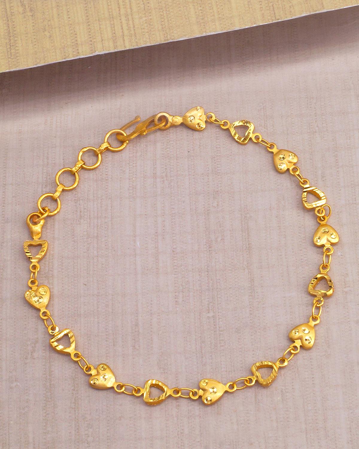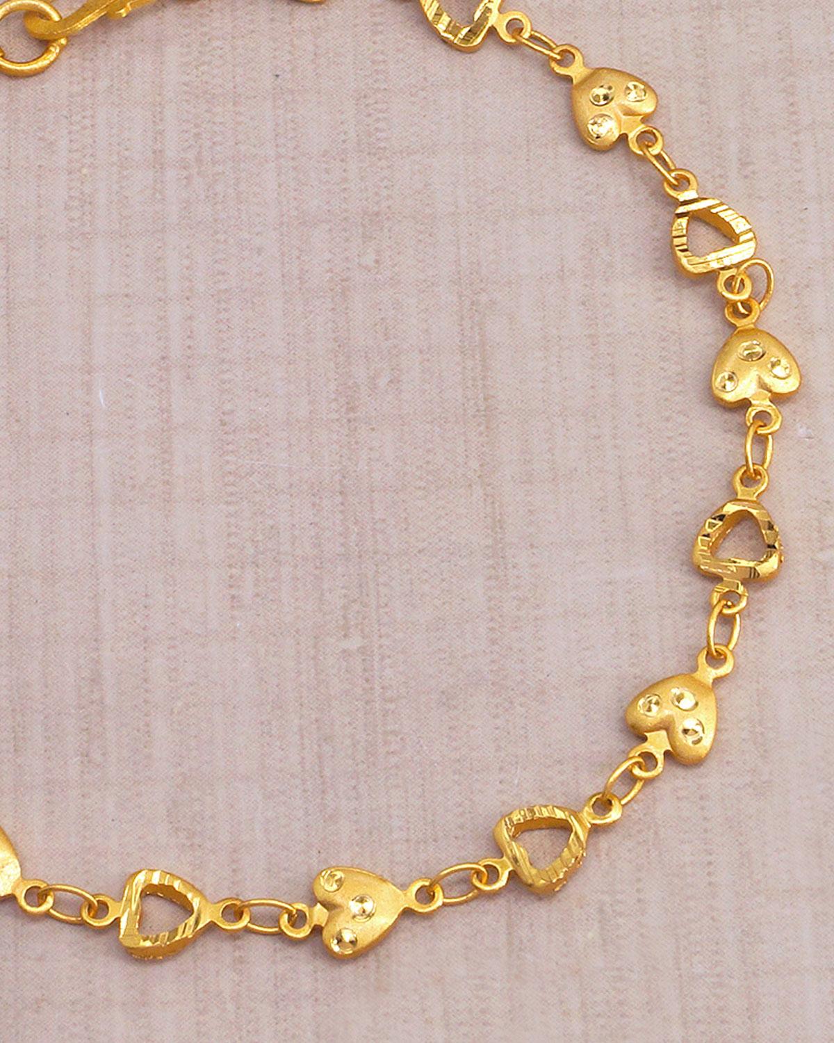 Celebrate love and elegance with this stunning 22K gold-plated bracelet, featuring a delicate sequence of heart-shaped links with intricate textures. Designed for both comfort and sophistication, this lightweight bracelet is perfect for everyday wear or special occasions. Its adjustable hook clasp ensures perfect fit for any wrist.