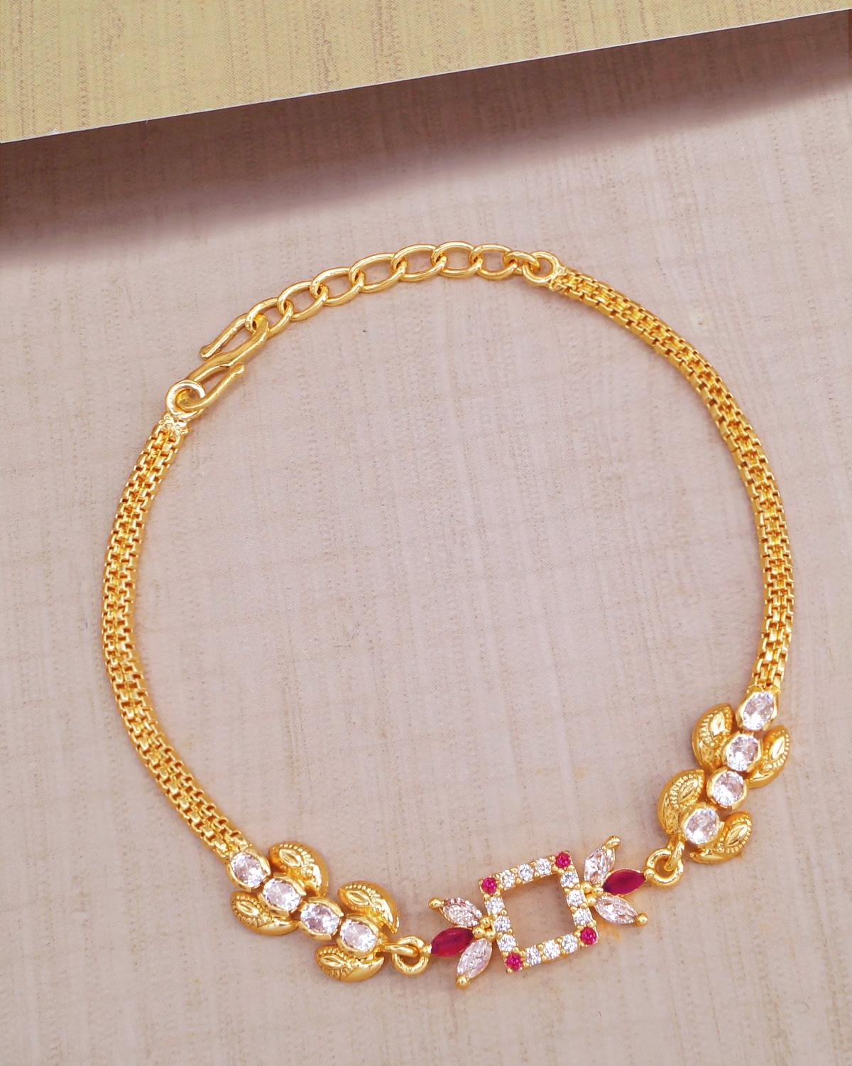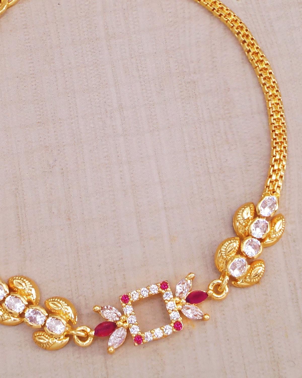Add a touch of sophistication with this Elegant Gold Tone Chain Bracelet, featuring square design adorned with ruby and white stones. The intricate detailing and gold-plated finish make it a timeless piece, perfect for both casual and festive occasions.
