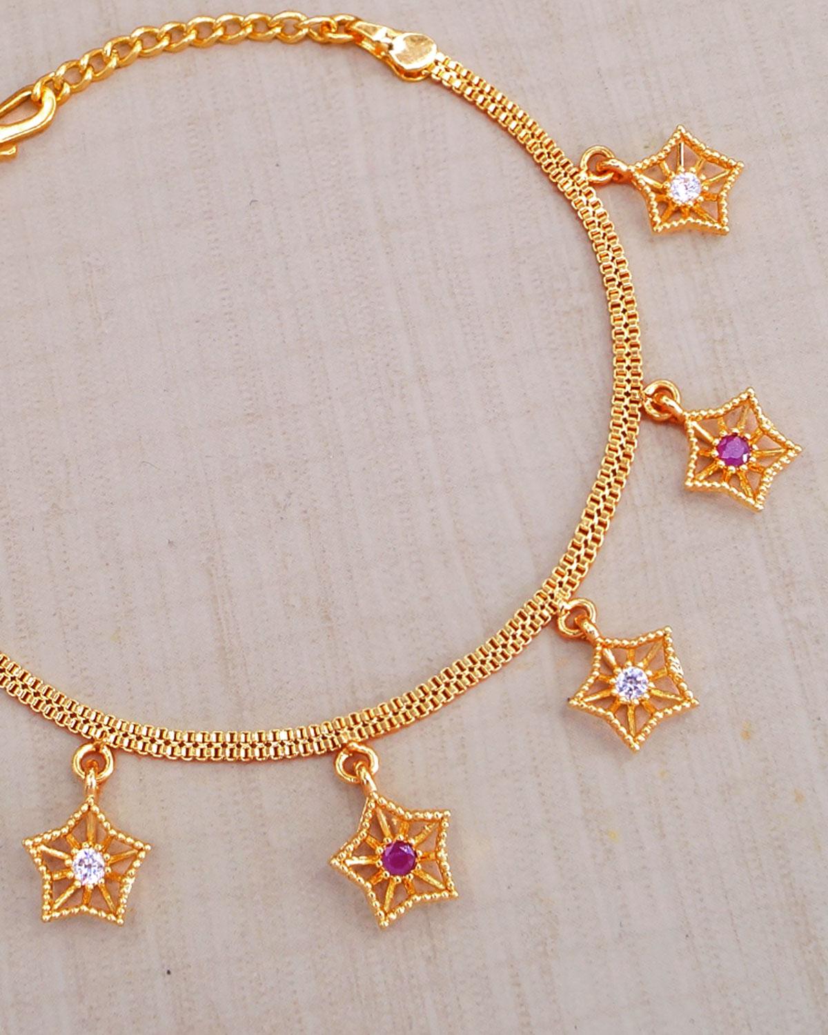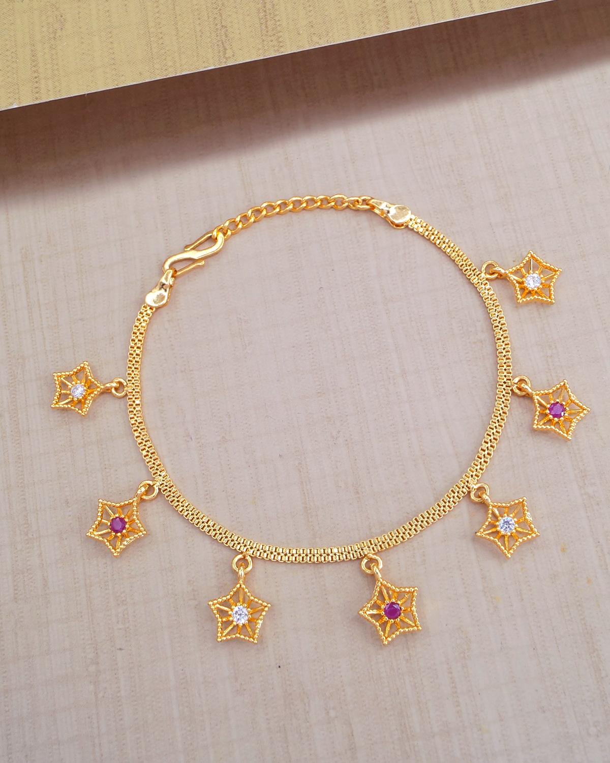 Illuminate your style with this exquisite gold star charm bracelet, designed to bring a celestial touch to your jewelry collection. Featuring delicate star-shaped pendants adorned with shimmering crystals and ruby-red accents, this bracelet is a timeless accessory that exudes elegance and grace.
