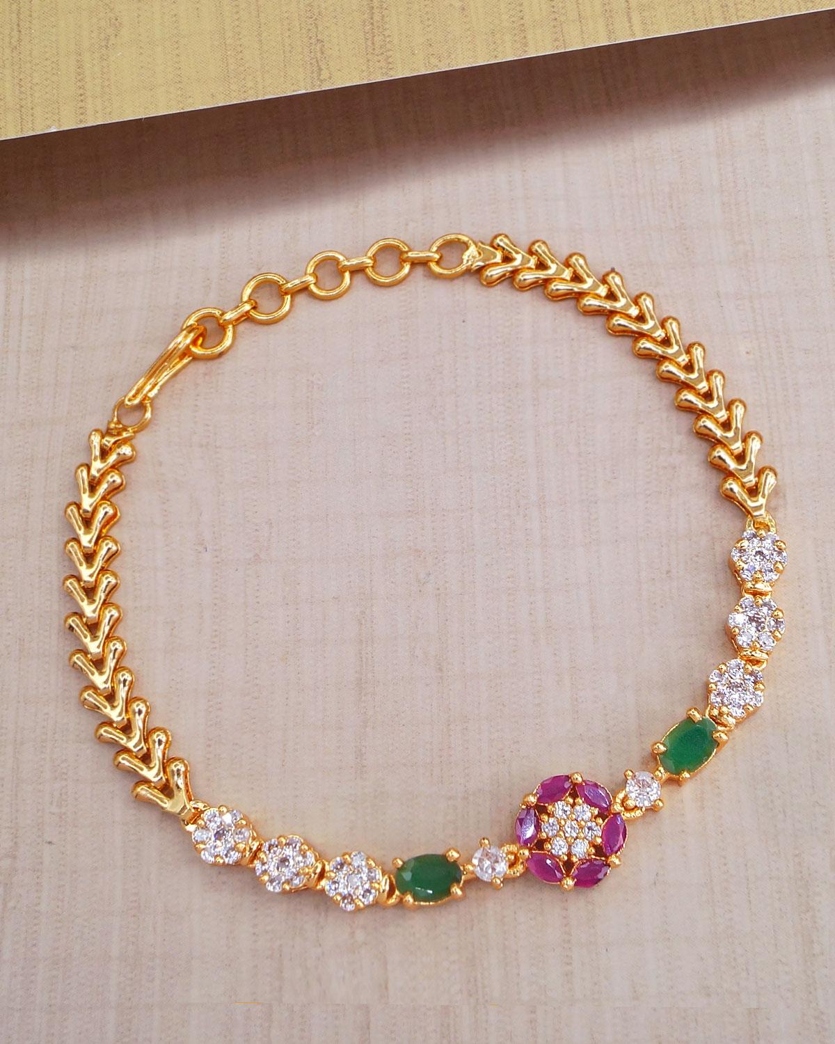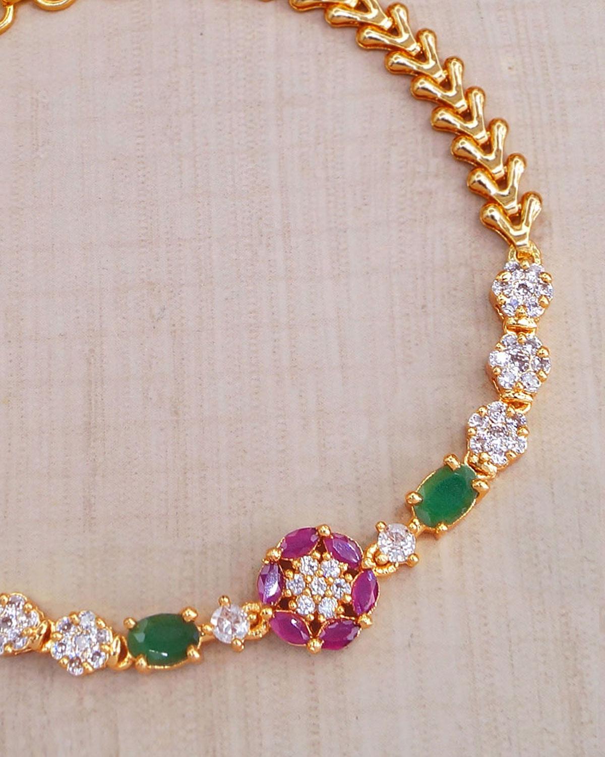 Add a touch of elegance to your jewelry collection with this stunning green stone gold-plated floral bracelet. Designed with high-quality cubic zirconia and intricate floral detailing, this bracelet is perfect for weddings, festive occasions, and everyday wear. The adjustable design ensures a comfortable fit, making it a must-have accessory for stylish women.