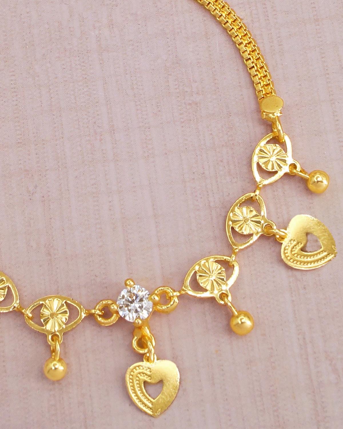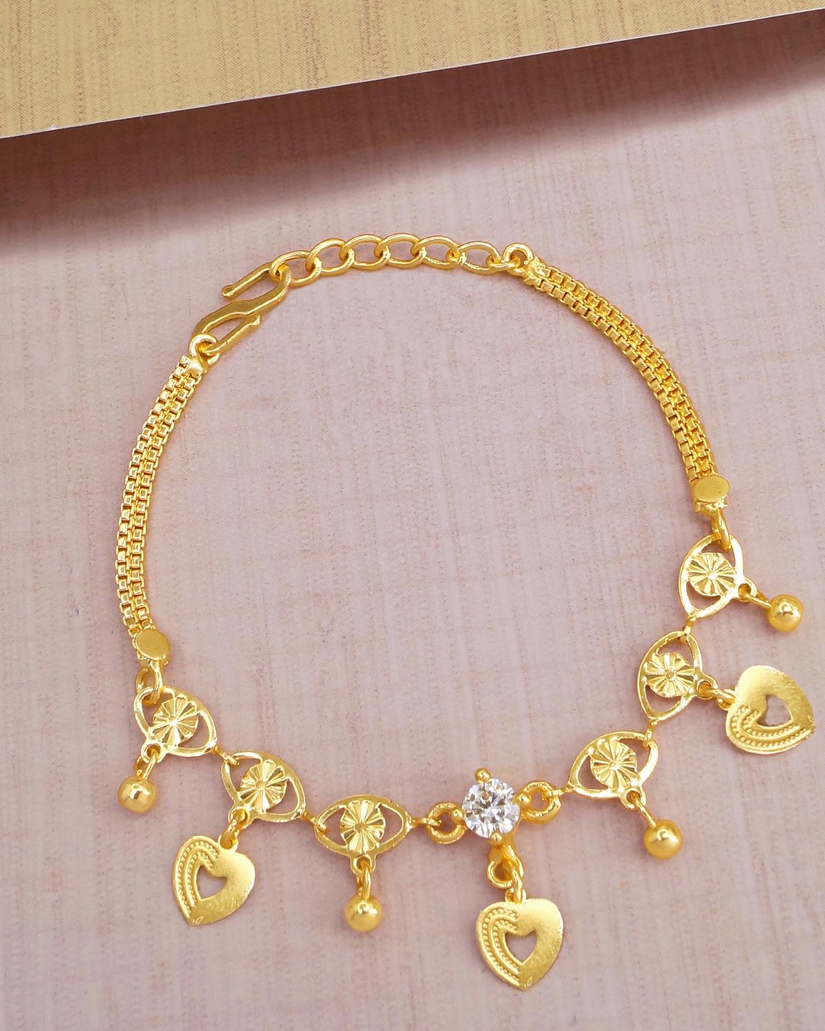 Enhance your style with this exquisite heart charm gold-plated bracelet, designed for elegance and grace. Featuring intricate floral patterns, delicate heart charms, and a dazzling stone centerpiece, this bracelet is perfect blend of tradition and modernity. Lightweight and adjustable, it is ideal for festive occasions, weddings, or daily wear.