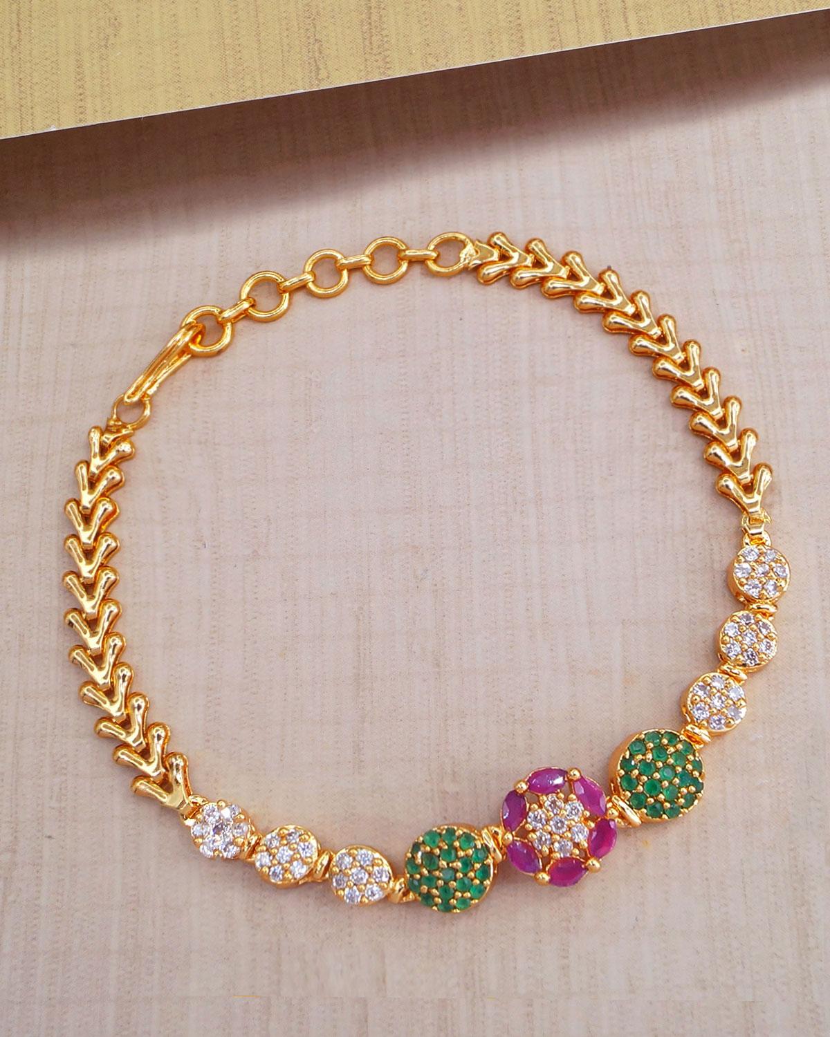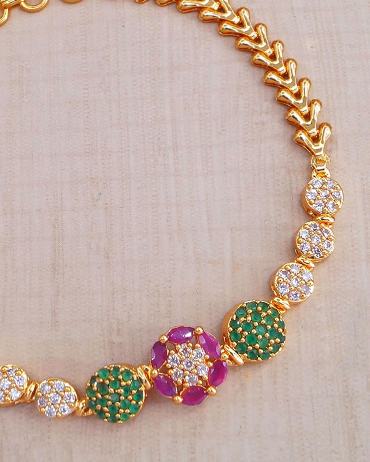 Enhance your look with this stunning ruby and green stone gold-plated bracelet. Designed with sparkling cubic zirconia stones, this elegant piece is perfect for weddings, parties, and festive occasions. Its adjustable fit ensures comfort while maintaining a luxurious appeal. A must-have accessory for women who love timeless fashion!