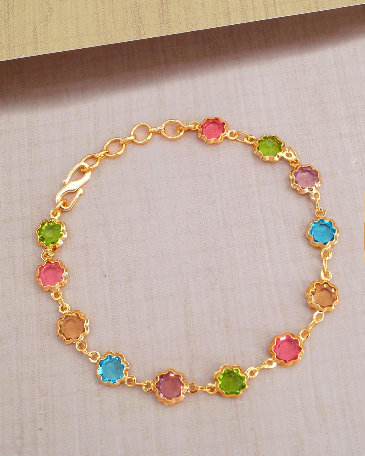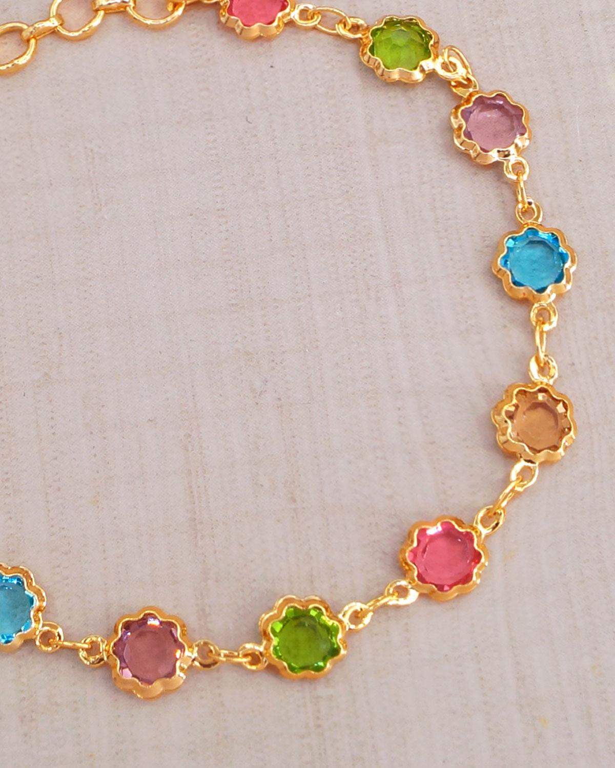 Add a splash of color to your jewelry collection with this vibrant multicolor gemstone bracelet. Featuring delicately crafted floral-shaped settings, each adorned with shimmering gemstones in a kaleidoscope of hues, this bracelet is a perfect blend of elegance and playfulness.