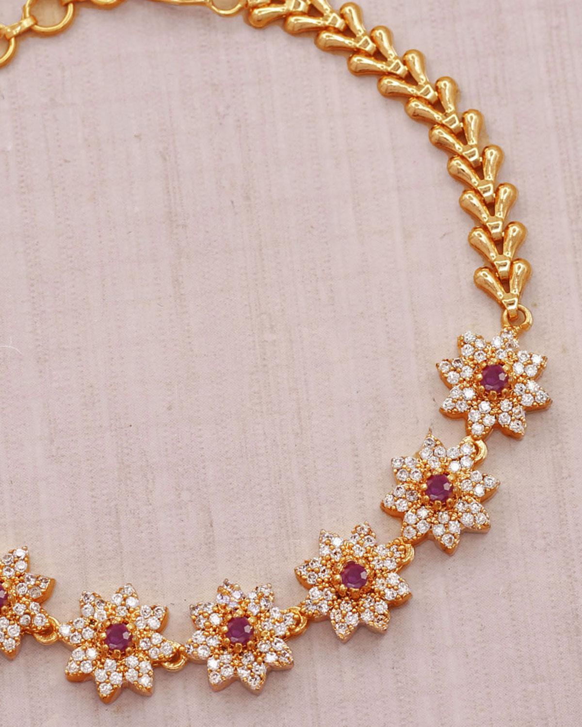 Bring a touch of nature's elegance to your jewelry collection with this enchanting golden floral bracelet. Adorned with intricate flower motifs, each centered with a vibrant ruby-red stone and surrounded by shimmering crystal petals, this bracelet is a masterpiece of timeless sophistication.