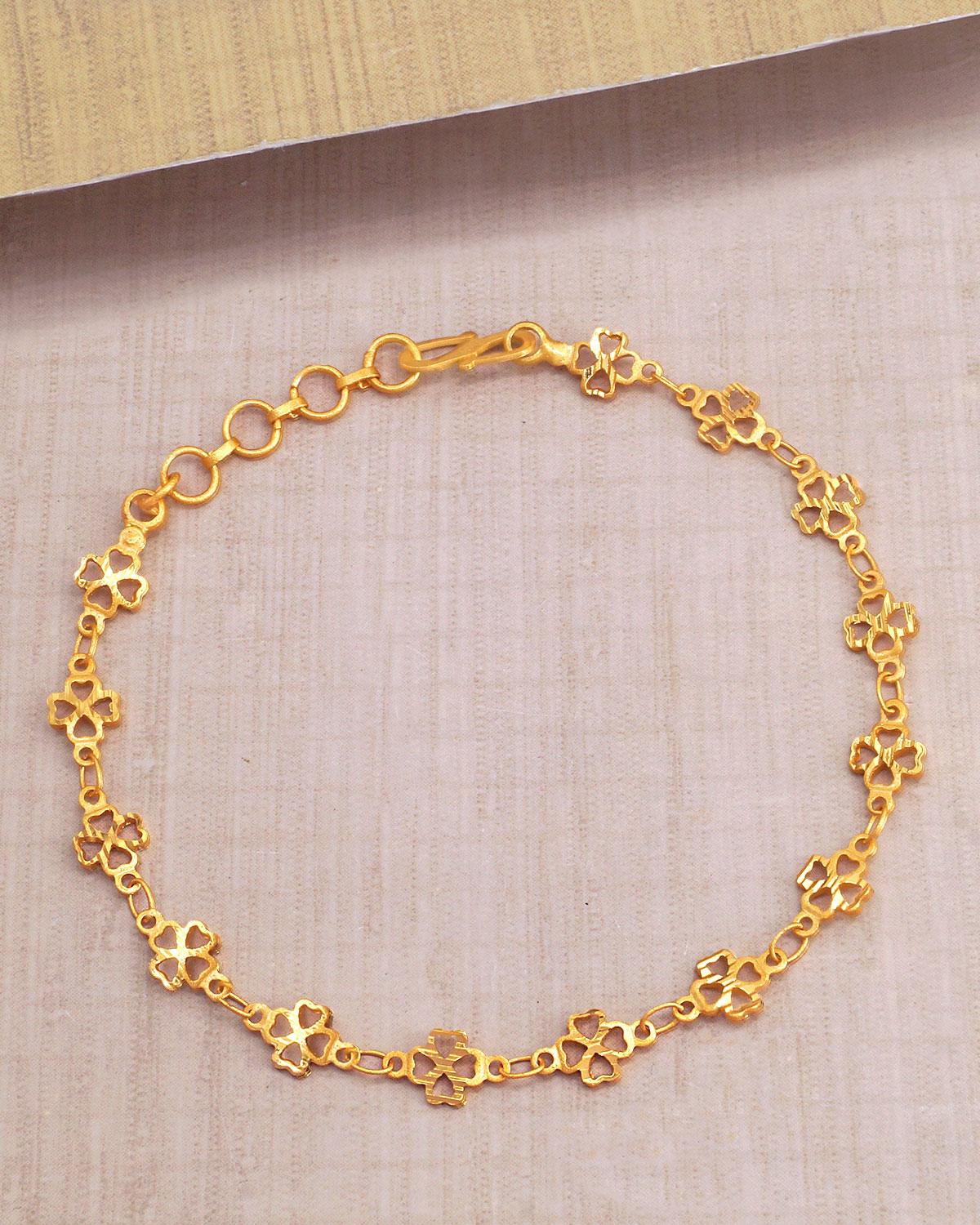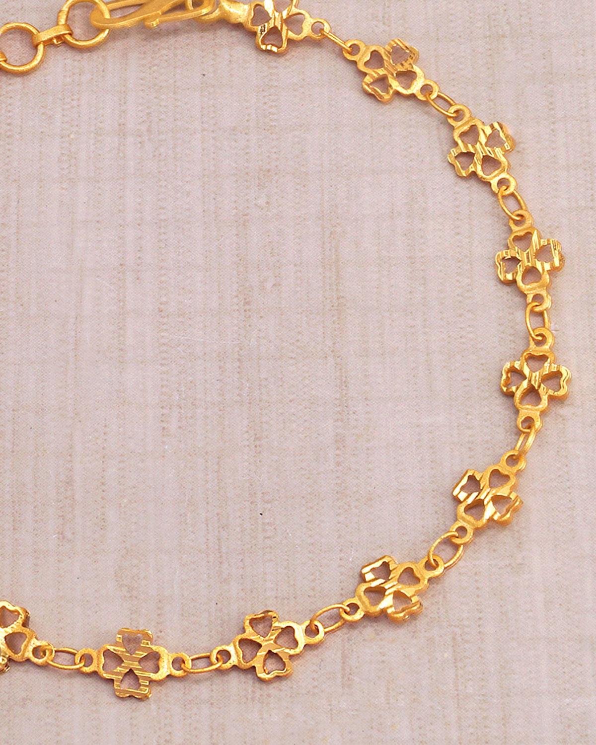 This gold clover link bracelet showcases a series of finely crafted openwork clover charms, connected for a graceful and airy design. Its lightweight structure ensures comfortable wear, while the adjustable clasp provides a secure fit. Perfect for layering or wearing alone, this bracelet adds charming touch to any jewelry collection.